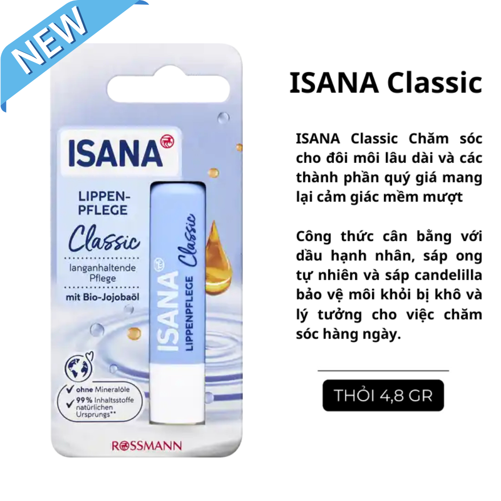 ISANA Classic Lippenpflege محصولی ایده‌آل برای مراقبت روزانه از لب‌ها است که با فرمولاسیون ملایم و مرطوب‌کننده، لب‌های شما را نرم و لطیف نگه می‌دارد. این بسته شامل یک بالم لب است که همراهی ماندگار برای حفظ رطوبت و مراقبت از لب‌ها در تمام فصول سال به شمار می‌آید.