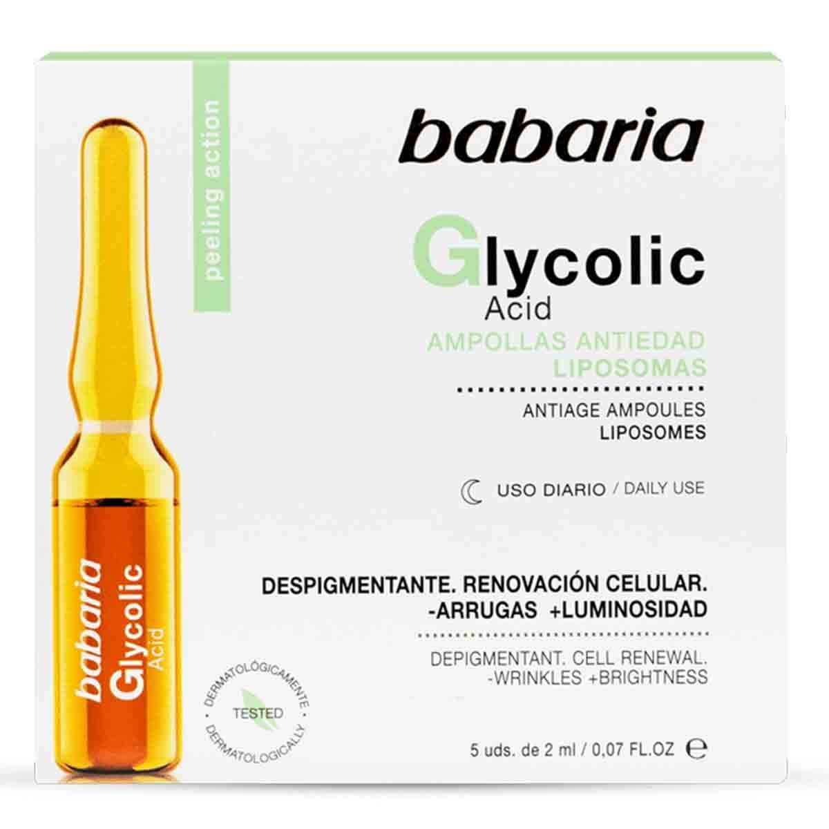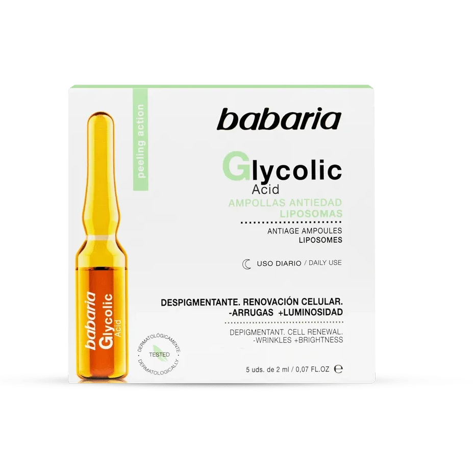 ویال (آمپول) ضد جوش و لایه بردار صورت باباریا babaria مدل گلیکولیک اسید Glycolic Acid حاوی 5 ویال 2 میل وگن و ساخت کشور اسپانیا میباشد.