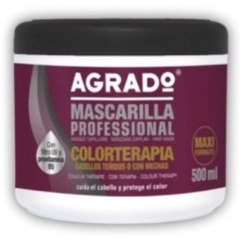 محصولی که در تصویر دیده میشود، "ماسکاریلا حرفهای آگرادو" است که در واقع یک ماسک مو (نه ماسکارای مژه) است و برای موهای رنگشده یا دارای هایلایت طراحی شده است، همانطور که از برچسب "Colorterapia" (رنگدرمانی) آن مشخص است. این محصول برای نرم کردن مو، احیای رنگ آن و محافظت از مو با فیلتر UV طراحی شده است.