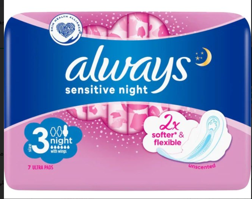 نوار بهداشتی الویز شب مدل حساس سایز 3 بسته 7 عددی ا ALWAYS SENSITIVE NIGHT SIZE 3 - 7 ULTRA PADS