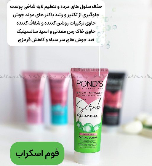 اسکراب ضد جوش صورت پوندز Ponds BHA Clay دارای فرمول جدید برای کاهش انواع جوش از جمله جوش های سرسیاه و حذف 99 درصد باکتری های ایجاد کننده جوش می باشد. اسکراب پوندز حاوی خاک رس برای پاک کنندگی و جذب چربی اضافی پوست و همچنین عصاره آویشن با خواص آنتی باکتریال برای جلوگیری از ایجاد جوش و آکنه می باشد. این ترکیب با کمپلکس انحصاری نیاسورسینول پوندز الهام گرفته از مفهوم علمی اتوفاژی Autophagy برنده جایزه نوبل پزشکی در سال 2016 برای افزایش شفافیت و درخشندگی پوست همراه شده است.